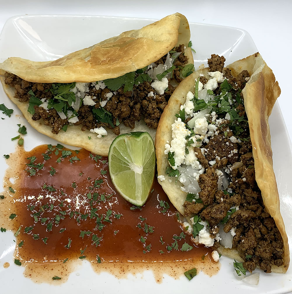 Two Corn tortillas filled with a choice of protein and then topped with crumbled Cojita Cheese, diced onions and cilantro accompanied with Spanish rice and Sautéed Black beans.